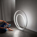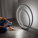 Moderna piantana composta da un intreccio di cerchi luminosi, realizzata con struttura in alluminio verniciato a polvere bianco opaco, nero o marrone cannella e diffusore in silicone. Ideale per illuminare ed arredare il soggiorno o la camera da letto. La serie si completa con sospensioni, plafoniere ed applique.