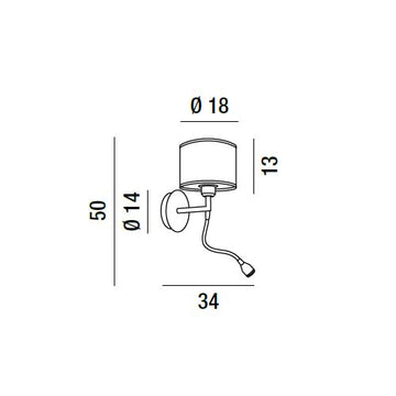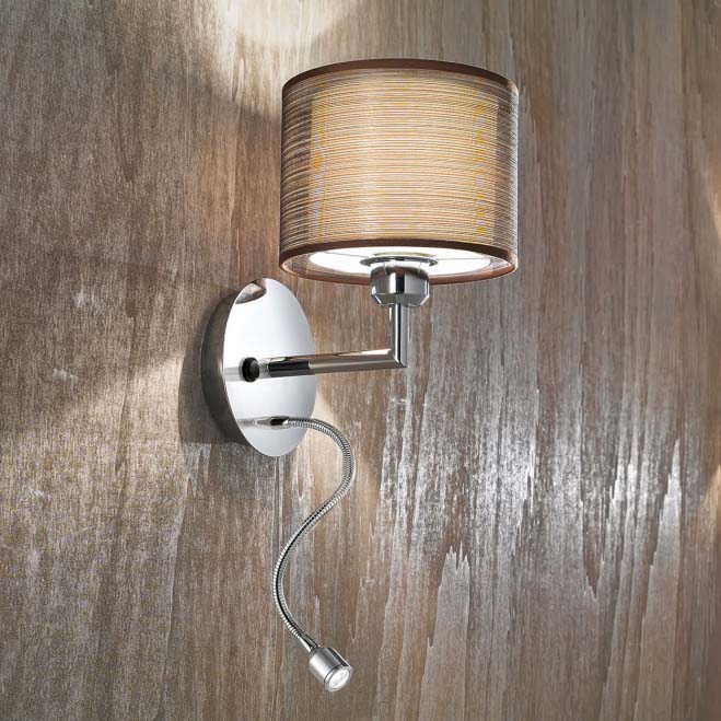 Perenz Applique moderna cromo lucido paralume in tessuto con luce direzionabile a Led, lampada da parete con montatura in metallo in finitura cromo e doppio paralume uno interno in tessuto bianco ed uno esterno in tessuto marrone. Dotata di doppia sorgente luminosa, una luce generale ed un braccetto flessibile per luce di lettura orientabile LED, ideale per illuminare il soggiorno living e altri ambienti della casa, ma anche camere di hotel.