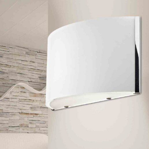 Lampada da parete con vetro soffiato bianco satinato. Montatura in metallo con laterali in acciaio lucido e chiusure superiore/inferiore in vetro temperato satinato.Country of Manufacturer