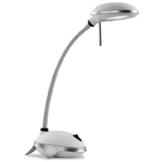 Lampada da tavolo in materiale termoplastico con sorgente led da 3W, tonalità calda, interruttore on/off nella base. Braccio flessibile. Disponibile in due versioni colore: bianco e argento.Country of Manufacturer