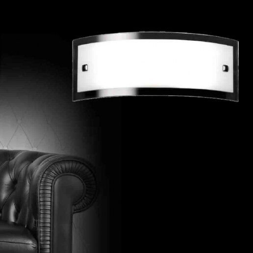Lampada da parete in vetro con bordo trasparente e parte centrale satinata. Perni di fissaggio cromati. Struttura in metallo.Country of Manufacturer