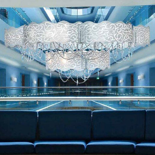 Dimensioni Diametro: 170 cm, Altezza: 100-200 cm.Descrizione ProdottoSospensione, vetro diffusore bianco latte inciso, pendenti in cristallo 30% al...