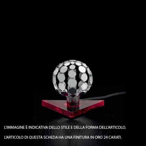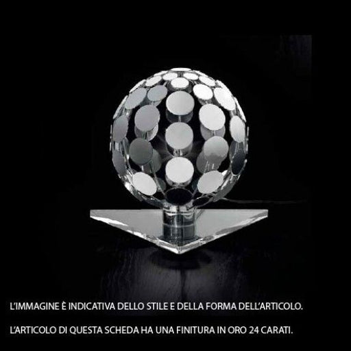 Dimensioni Diametro: 20 cm, Altezza: 24 cm, Sporgenza: 23 cm.Descrizione ProdottoLampada da tavolo, finitura cromo e oro 24 carati. Impermeabilità ...