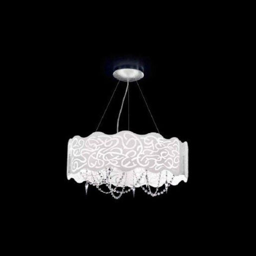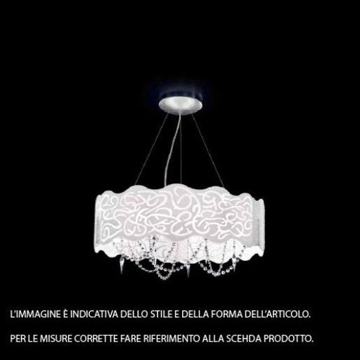 Dimensioni Diametro: 50 cm, Altezza: 35-150 cm.Descrizione ProdottoSospensione, vetro diffusore bianco latte inciso, pendenti in cristallo 30% al p...