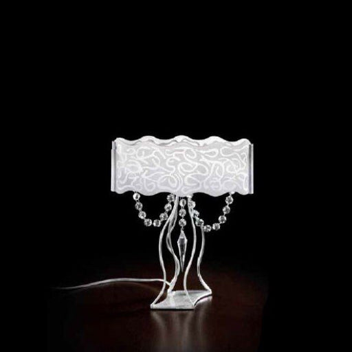 Dimensioni Altezza: 34 cm, larghezza: 25 x 12 cm.Descrizione ProdottoLampada da tavolo, vetro diffusore bianco latte inciso, pendenti in cristallo ...
