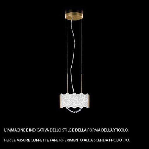 Dimensioni Diametro: 40 cm, Altezza: 35-150 cm.Descrizione ProdottoSospensione, vetro diffusore bianco latte inciso, pendenti in cristallo 30% al p...