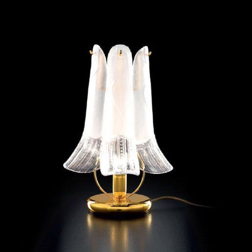 Dimensioni Diametro: 24 cm, Altezza: 39 cm.Descrizione ProdottoLampada da tavolo, vetro bianco, rosa, ambra, finitura oro lucido 24 carati o cromo....