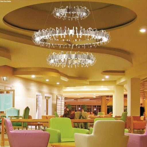 Dimensioni Diametro: 100 cm, Altezza: 40 - 160 cm.Descrizione ProdottoSospensione, vetro metacrilato trasparente , finitura cromo o oro 24 carati. ...
