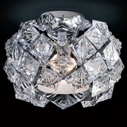 Dimensioni Diametro: 64 cm, Altezza: 28 cm.Descrizione ProdottoPlafoniera, vetro metacrilato trasparente sfacettato, finitura cromo o oro 24 carati...