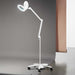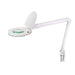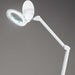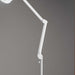 Lampada da terra in plastica colore bianco. Completa di un morsetto, lente da ingrandimento, interruttore touch posto sul diffusore e piedistallo bianco con ruote.