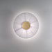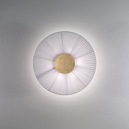 Collezione di lampade a parete e soffitto, con struttura metallica verniciata bianca e lavorata a mano con tessuto ignifugo pongé, disponibile in due misure e colori da campionario. Particolare in metallo verniciato in 4 colori: bianco, foglia oro, foglia argento, foglia rame.