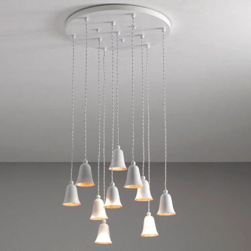 Collezione di lampade a sospensione dieci luci in metallo verniciato raggrinzato. Disponibili in nelle seguenti versioni: esterno bianco opaco/ interno bianco opaco ed esterno bianco opaco/interno foglia oro.