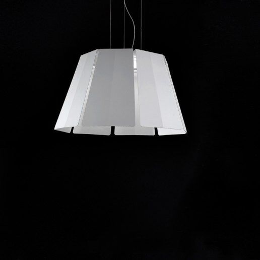 Collezione di lampade a sospensione con struttura portante in MDF e alluminio, disponibili in tre diverse dimensioni. Composizione in alluminio verniciato bianco opaco raggrinzato. Diffusore in metacrilato bianco. La scelta del cavo elettrico può variare dal trasparente in silicone al tessuto rosso o nero.