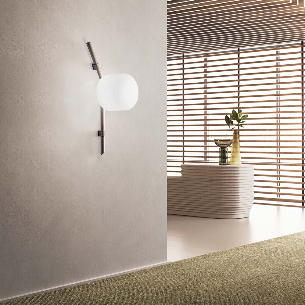 Le sorprendenti forme del corallo gorgonia ispirano una struttura di grande impatto visivo e materico. Importanti sono le dimensioni del cilindro smussato in vetro opalino e della barra in alluminio che compongono Floed. Da installare a parete o a plafone.