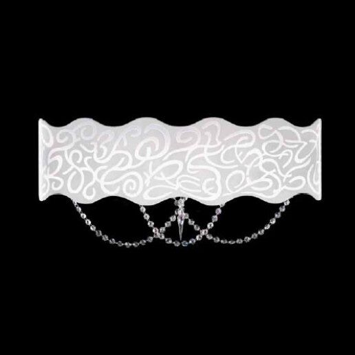 Lampada da parete, vetro diffusore bianco latte inciso, pendenti in cristallo 30% al piombo e swarovski strass. Finitura bianco, foglia oro o foglia argento. Impermeabilità grado IP 20.Country of Manufacturer