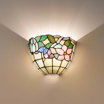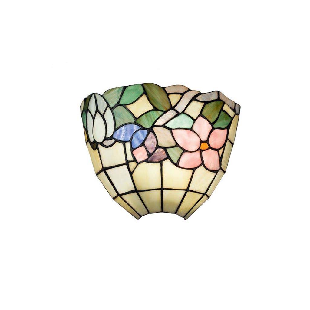Applique in vetro decorato, ottenuto fissando a mano tra loro dei pezzi di vetro colorati con una miscela di stagno e piombo, che creano un motivo floreale, tipico delle lampade Tiffany. Manufatto di alta qualità artigianale.